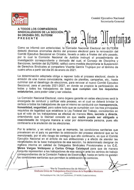 De tal suerte que la comisión nacional electoral del SUTERM, acordó convocar a nuevas elecciones para renovar al comité ejecutivo seccional de Orizaba, para el período 2021-2027 y mientras transcurre la contingencia sanitaria, de acuerdo a las atribuciones del comité ejecutivo nacional, designó a Nereo Vargas Velázquez y Carlos Ortega Calatayud como representantes interinos de la sección 84 Orizaba del SUTERM.