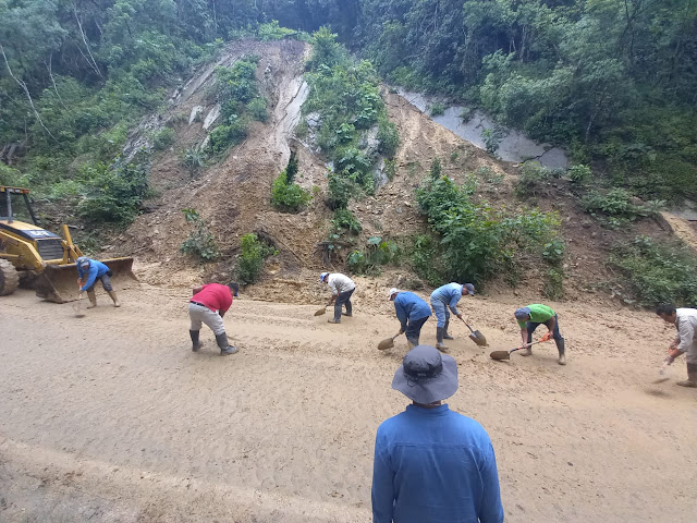 Ixtaczoquitlán, Ver. 30/06/21 (LasAltasMontañas). Con ayuda de maquinaria personal del Ayuntamiento de Ixtaczoquitlán trabaja en la limpieza de la carretera Cumbre de Tuxpango - Campo Chico tras los deslaves que se presentaron está madrugada de miércoles a consecuencia de las fuertes lluvias.
